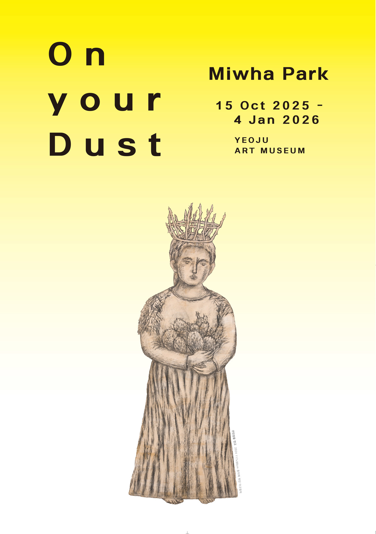 흙. 그렇게 작가는 흙먼지처럼 먼지가 유래한 원형 물질이라고 해도 좋을, 어쩌면 먼지와 같은 원소를 공유하고 있을지도 모를 흙을 빚어 조각을 만들고 그림을 그렸다. 날개가 부러진 죽은 새를, 바닥에 엎어진 아기를, 바닥에 던져진 얼굴을, 표정이 없는 얼굴을, 얼굴이 없는 몸통을, 팔을, 다리를, 깨진 유리창을, 죽은 강아지를, 죽은 강아지를 안고 있는 여인을, 꽃을 든 여인을, 가시관을, 마른 꽃을, 시든 꽃을, 꽃을 든 천사를, 태양을 상징하는 새 삼족오를, 고라니를, 개를 만들고 그렸다. 머리도 없고 날개도 없는 것들을, 목도 없고 팔도 없는 것들을 만들고 그렸다. 유독 꽃을 든 여인이, 꽃을 건네주는 여인이 눈에 들어온다. 아마도 죽은 것들에 바치는 헌화를 의미할 것이다. 오마주를 의미할 것이다. 속절없는 존재를 향한 연민을 의미할 것이다.